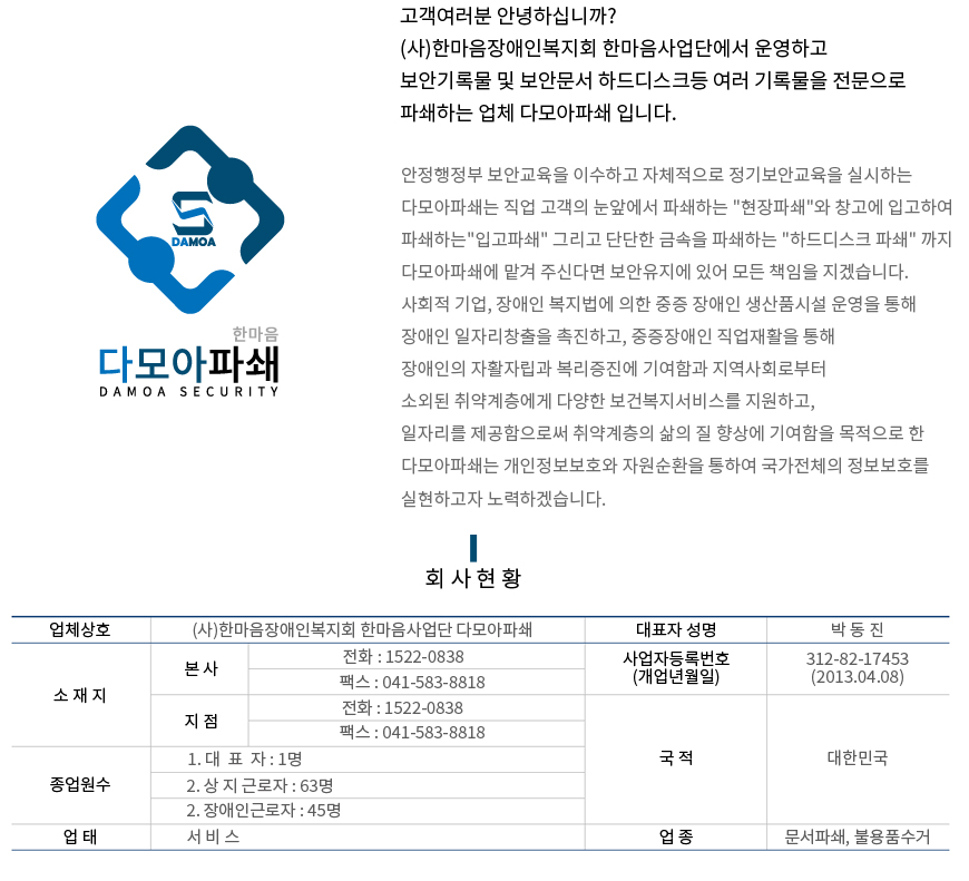 본사 : 충청남도 천안시 수신면 백자3길 96 ㅣ 보안파쇄작업장 : 충청남도 천안시 수신면 백자3길 200