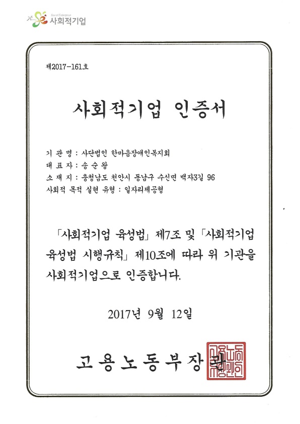 사회적기업 인증서