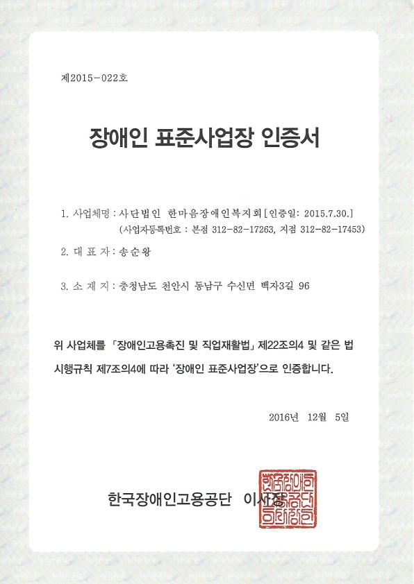 장애인 표준사업장 인증서